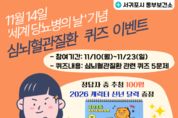 서귀포시 동부보건소는 2025년 ‘세계 당뇨병의 날(11. 10.)’을 기념하여 11월 10일부터 11월 23일까지 14일간 모바일 앱 ‘워크온’을 활용한 심뇌혈관질환 퀴즈 이벤트를 운영한다. 이번 퀴즈 이벤트는 지역 주민들에게 고혈압, 당뇨병 등 선행질환을 포함한 심뇌혈관질환에 대한 올바른 정보제공과 건강생활실천 습관을 독려하기 위해 마련되었으며, 서귀포시 동부 지역 주민이라면 모바일 걷기 앱인 ‘워크온(WalkOn)’을 통해 쉽게 참여할 수 있다. 참여 방법은 ‘워크온(WalkOn)’앱 내 서귀포시 동부보건소 ‘하영걸을락’ 커뮤니티에 가입한 후, 심뇌혈관질환 퀴즈 5문제를 다 풀고 응모하기 버튼을 누르면 된다. 퀴즈 참여 정답자 중 추첨을 통해서 100명에게는 소정의 기념품도 제공된다. 서귀포시 동부보건소 관계자는 “이번 이벤트로 지역 주민들이 자기 혈관 수치에 관심을 갖고, 스스로 건강관리 계기를 마련하였으면 좋겠다”라고 말하며, “많은 사람들이 참여하여 심뇌혈관질환 예방 실천의 중요성을 알고, 더 나아가 주변에 알릴 수 있기를 바란다”라고 하였다. 기타 사항은 서귀포시 동부보건소 방문간호팀(☎ 064-760-6137)으로 문의하면 된다.
