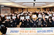 제주시는 지난 11일 메종글래드 제주에서 열린 한국외식업중앙회 제주특별자치도지회 제주시지부 정기총회에서 ‘친절 품은 제주시: 정직한 가격, 따뜻한 마음’ 실천 다짐 선언식을 개최했다. 이날 행사에는 식품접객업소 영업주 등 300여 명이 참석했으며, 영업주 대표의 선언서 낭독을 시작으로 ▲‘친절은 심박호게, 가격은 코삿ᄒᆞ게’ ▲‘가격은 투명하게, 친절은 진심으로’ ▲‘정직은 기본이우다, 친절은 정성이우다’ 등 카드섹션 퍼포먼스를 통해 정직한 가격과 진심 어린 서비스를 제공할 것을 다짐했다. 아울러 참석자들은 “친절한 제주시, 우리가 만들쿠다!”라는 구호를 제창하며, 식품접객업소 영업주 스스로가 친절 문화 확산의 주역이 될 것을 결의했다. 제주시는 이번 선언식을 계기로 식품접객업소 영업주들의 ‘약속 릴레이’를 연중 운영하고, 하반기에는 시민과 관광객이 참여하는 ‘정직·친절 업소 칭찬 이벤트’와 제주 관광 이미지 개선을 위한 ‘숏폼 공모전’ 등 다양한 캠페인을 추진해 ‘친절 품은 제주시’ 확산에 박차를 가할 예정이다. 김완근 제주시장은 “앞으로도 제주시 관광 이미지 개선과 관광객 신뢰 회복을 위해 ‘친절 품은 제주시’ 만들기에 최선을 다하겠다”고 말했다.